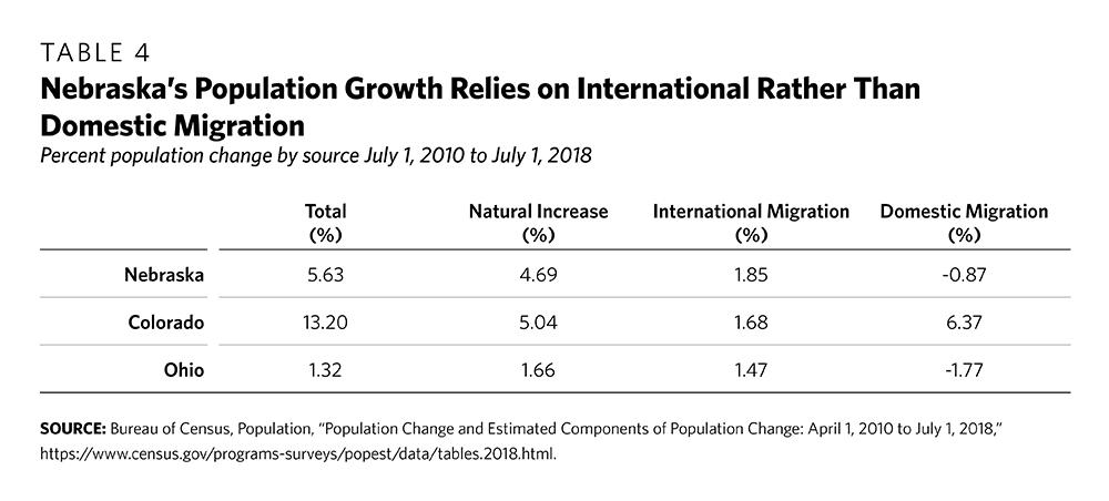 Yet Nebraska is more than just an ag state or a red state. More than half the state’s population now lives in the Lincoln and Omaha metropolitan areas—two areas that have become increasingly cosmopolitan and remain politically diverse.3 In these areas, banking, financial services, insurance, state government, transportation, healthcare, and universities anchor modern, diversified economies.4 And in the last decade, Lincoln and Omaha have boasted some of the highest rates of refugees per capita in the nation.5 In 2008, president Barack Obama picked up one of the state’s five electoral votes by winning the second congressional district, where Omaha is located. Nebraska and Maine are the only two states where it is possible for electoral votes to be split among multiple presidential candidates.6 And Nebraska is the only state with a unicameral, nonpartisan state legislature.7 It is indeed a unique state, yet at the same time, its population growth, levels of postsecondary education, and percentage of workforce in manufacturing all approximate the national average (see Table 1).