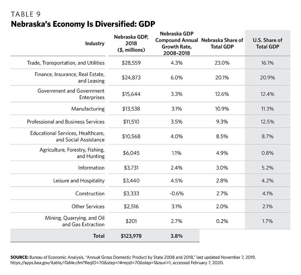 Nebraska’s economy is historically agricultural-based. While this tradition continues, its economy has become increasingly diversified. As shown in Tables 9 and 10, Nebraska’s service industries—including trade, transportation and utilities, and education and healthcare—contribute substantially to the state’s GDP and employment. Nebraska, however, lags behind the nation as a whole in terms of the share of its economy in several high-wage industries, such as information and the professional, scientific, and technical services component of the professional and business services industry.4